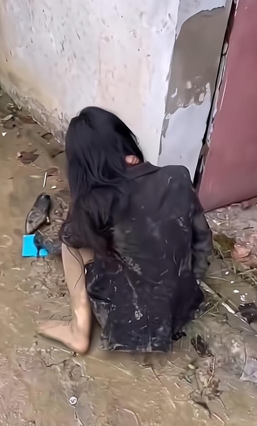 女子光着脚,蹲在地上低着头,衣物上的污物也顾不上擦。