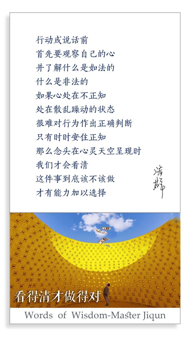 行动或说话前,首先要观察自己的心,并了解什么是如法的,什么是非法的。如果心处在不正知,处在散乱躁动的状态,很难对行为作出正确判断。只有时时安住正知,那么念头在心灵天空呈现时,我们才会看清,这件事到底该不该做,才有能力加以选择。