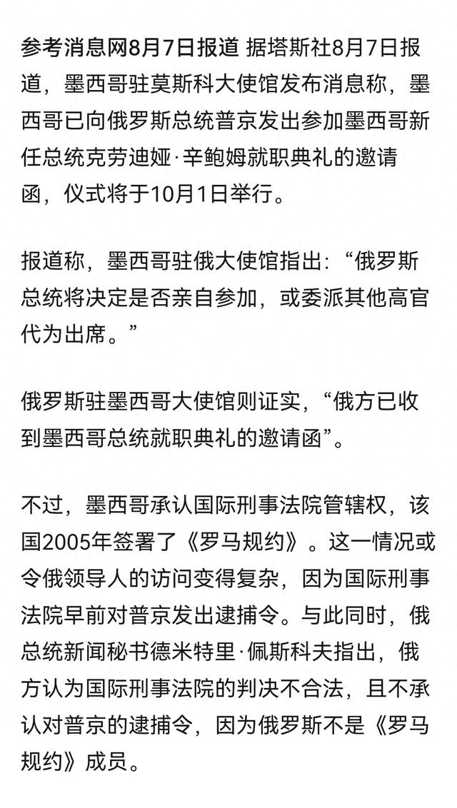 虽然墨西哥对俄罗斯总统普京发出了邀请,去参加墨西哥新任总统10月1日的就职典礼,但估计俄罗斯总统普京还是不会去的。国际刑事法院早前对俄罗斯总统普京发出了逮捕令,而墨西哥又是国际刑事法院《罗马规约》的缔约国,虽然墨西哥非常肯定不会对俄罗斯总统普京予以逮捕,可如果去了,风险还是很大。如果像当初扣留华为孟晚舟一样吗?这一扣就是三年。墨西哥毕竟是美国的邻居,谁能保证不发生问题呢?