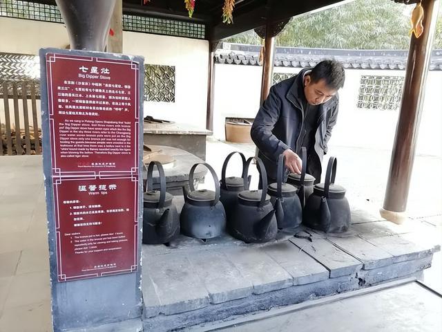 原来是灶上有七个孔,一次可以煮七壶茶,可见当时阿庆嫂生意真不错,需要这种大规模工业化设备来煮茶。这里自然忘不了还有那水缸里面把身藏的大水缸,还有两个大水缸。