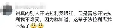 有网友调侃道:“别人开法拉利我眼红,但是雷总开法拉利我不难受,因为就知道,这辈子法拉利离我不远了。”、“出个20万的法拉米,贷款去买。”