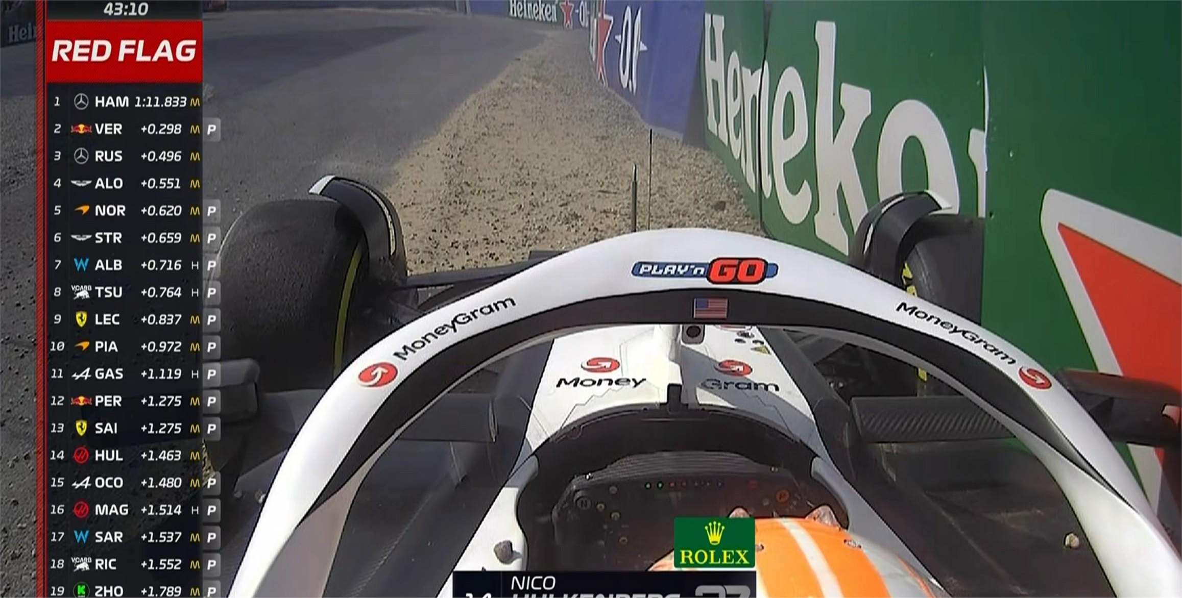 在激烈的竞争中,意外总是难免的。霍肯伯格在1号弯后胎锁死,赛车失控上墙,这一突发状况导致了二练的暂停。这样的意外虽然令人遗憾,但也正是F1比赛中不可或缺的一部分,它考验着车手的应变能力和车队的应急处理。
