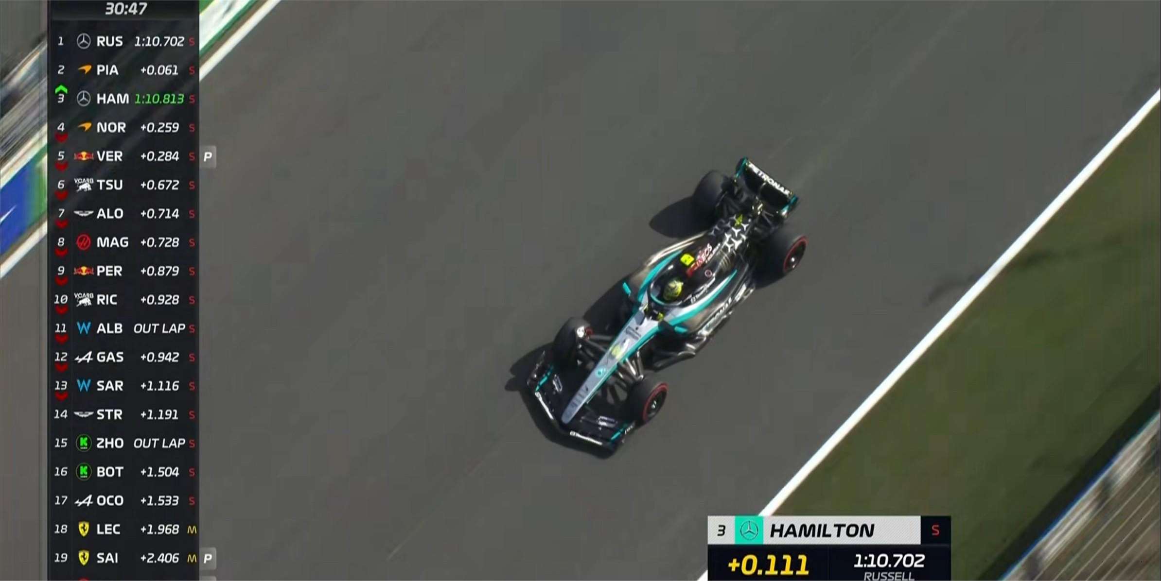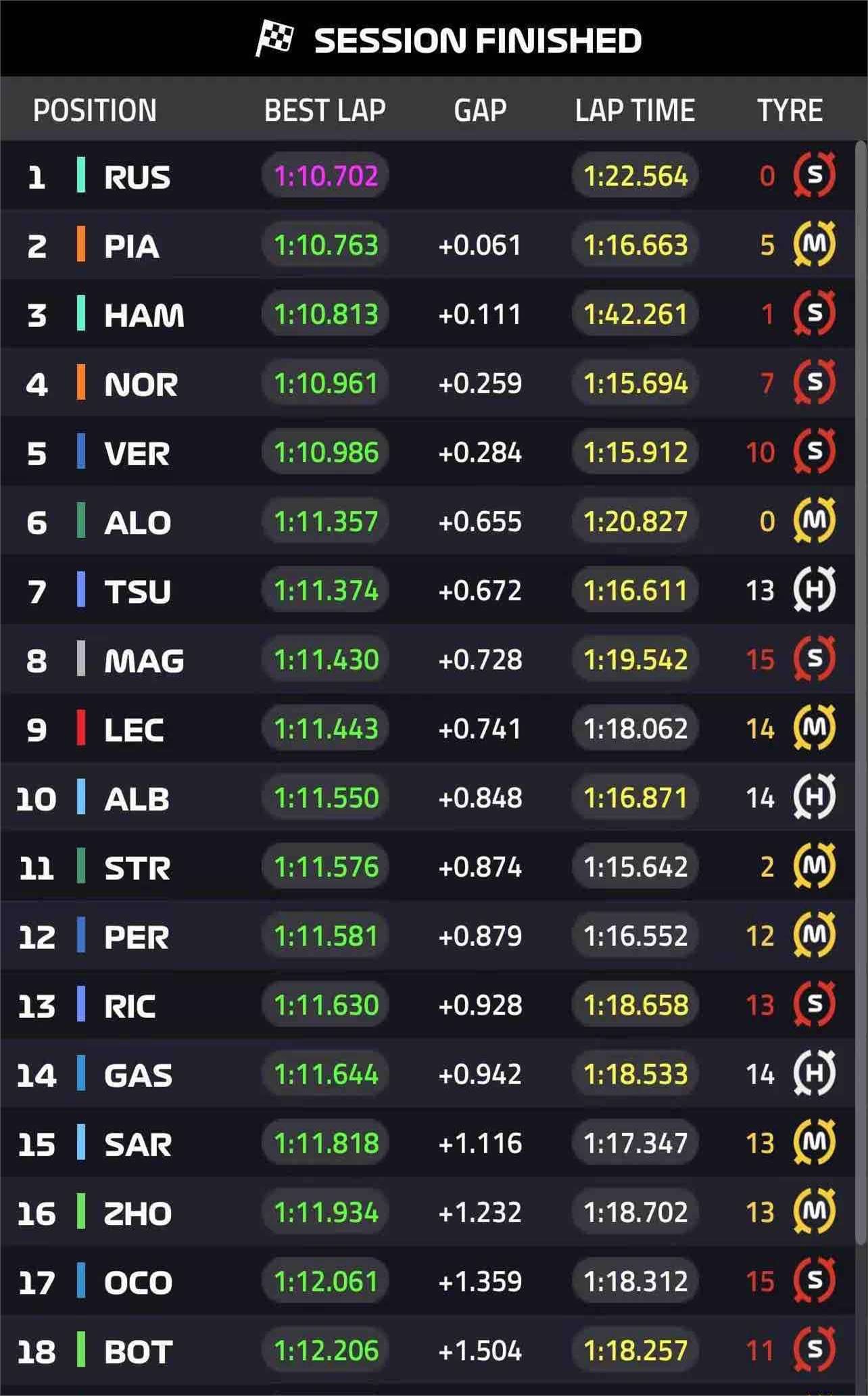 二练成绩方面,拉塞尔以出色的表现位居榜首,皮亚斯特里和汉密尔顿分别位列第二和第三,他们的出色发挥为接下来的比赛奠定了坚实的基础。佩雷兹和周冠宇分别排名第12和第16,尽管排名相对靠后,但他们的表现同样值得关注,他们将继续努力提升自己的成绩。