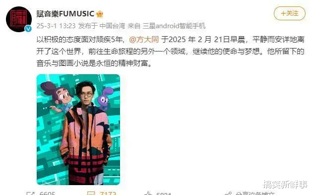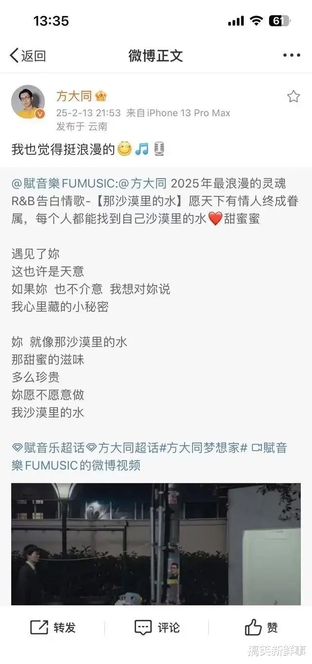 真没想到,这个深夜听到这个噩耗,泪目了。前几天他还在微博上说"我也觉得挺浪漫的",可谁能想到,这竟成了他人生的最后一句话。这个"挺浪漫的"男人,就这样悄悄地离开了。知道吗?方大同这个男人,他不会投机取巧,不会哗众取宠,他就是纯粹地在做音乐。记得他出道时,华语乐坛正值快歌当道,他却固执地坚持着自己的R&B风格。你们还记得《Love Song》吗?那首歌里唱着"让我再为你唱一首情歌",唱得多少人心碎。他是那种特别纯粹的音乐人,从不炒作,也不靠绯闻上头条。为什么说他特别?他的每一首歌都像一杯陈年老酒,越品越有味道。《特别的人》《三人游》《春秋》,哪一首不是经典中的经典?2020年,他被查出患病。5年了!整整5年!没人知道他经历了怎样的痛苦,可他从不在公众面前提起病痛。他只是默默地创作,默默地发歌,默默地画他的图画小说。去年金曲奖上,他拿下"最佳国语男歌手奖"时说的那句"音乐是我的解药",现在想来格外心疼。有人说,方大同就像一个不属于这个时代的音乐人。在这个流量至上的年代,他始终坚持着自己的创作理念。不赶潮流,不玩套路,只做最真实的自己。他的歌里从来不缺爱情,但他唱的不是轰轰烈烈,而是细水长流。