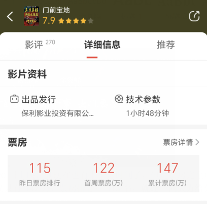 累积票房仅仅只有147万,票房排行在115名,就连一向大方给分的某眼都只给到了7.9分。