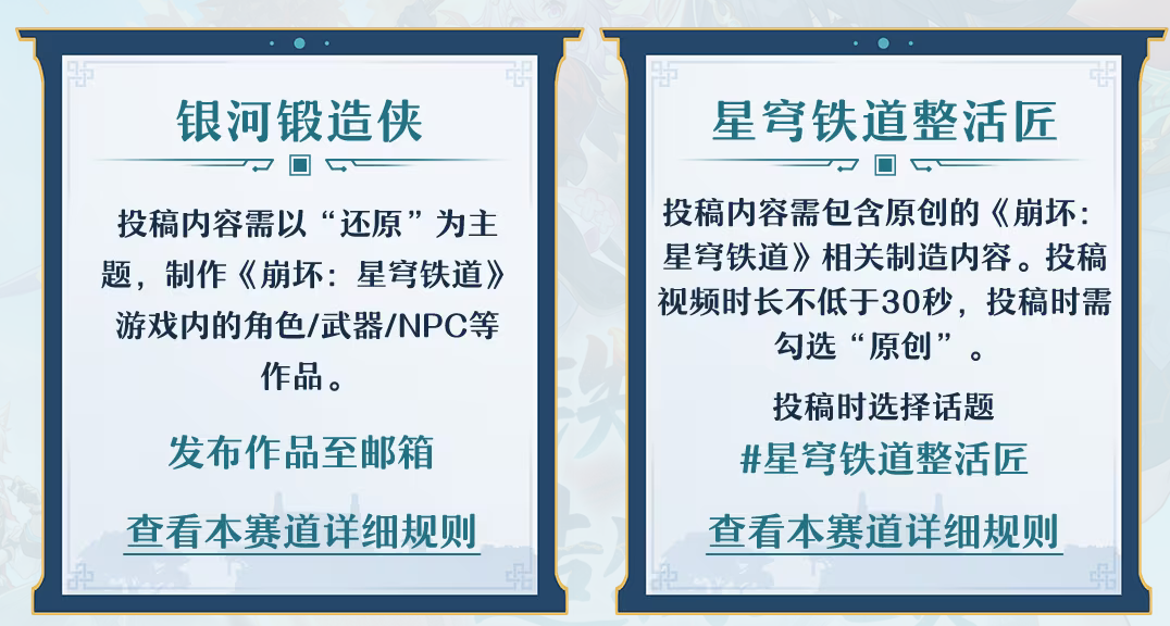 本次挑战分为两个赛道,一是“银河锻造侠”,玩家可以制作星穹铁道游戏内的角色、武器、NPC等,要以还原为主题。