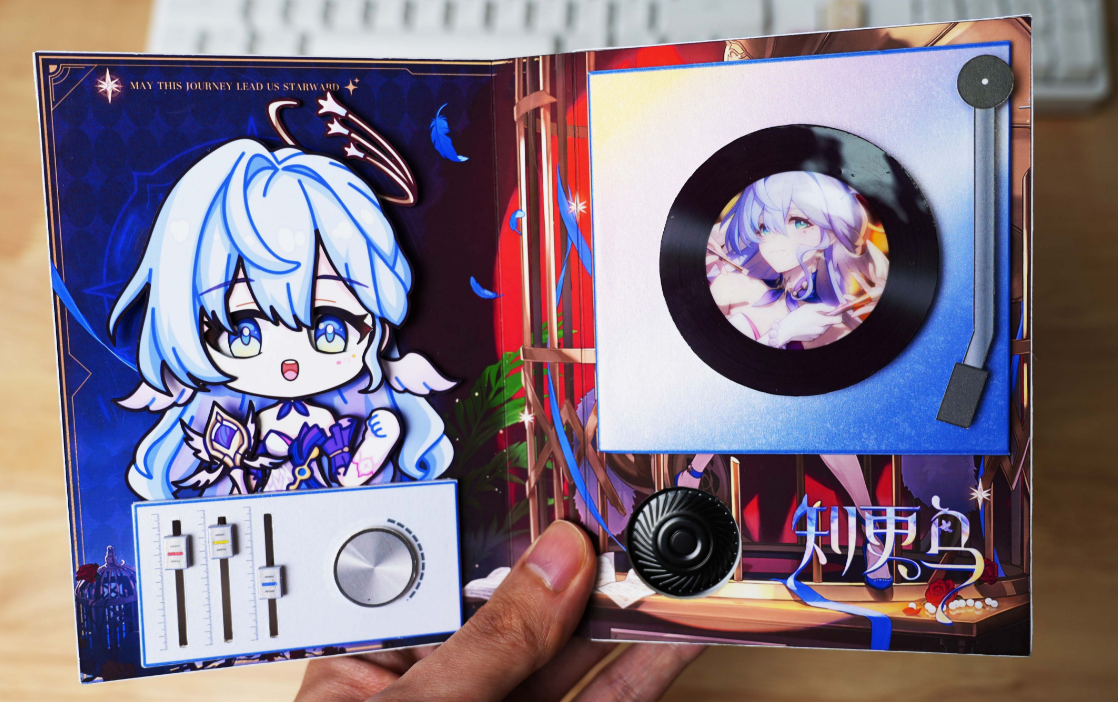 还有利用卡纸和霍尔传感器,制作出可以旋转的知更鸟唱片,看着高声歌唱的小鸟和黑胶卡带,曾引来百万玩家呼吁上架周边。