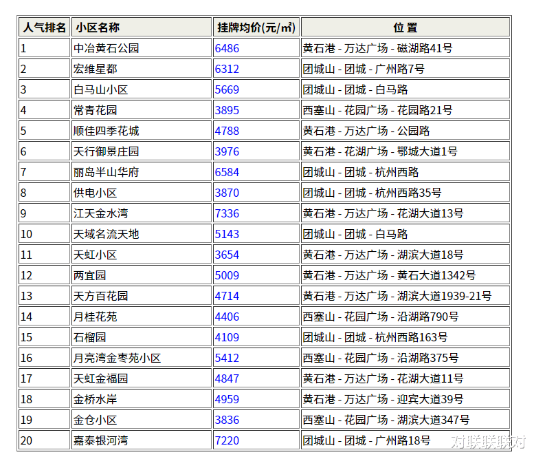 人气1、中冶黄石公园:6486元/平, 位置:黄石港 - 万达广场 - 磁湖路41号