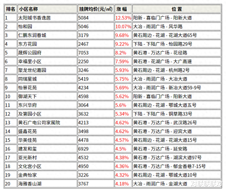 黄石二手房本月涨幅最大的小区排行1、太阳城书香逸居:5084元/㎡,上涨+12.53%,位置:阳新 - 喜临门广场 - 阳新大道