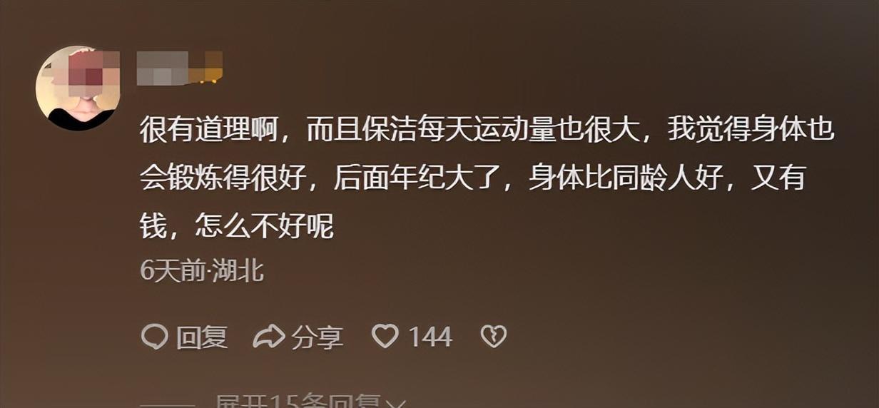 有个网友说:保洁每天运动量大,身体也会得到锻炼,后面年纪大了,身体还比同龄人好,又有钱,还是挺好的。