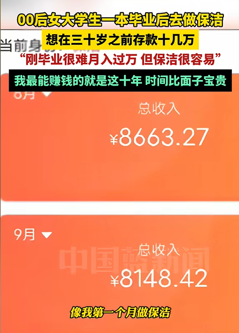 这个00后一本毕业的女大学生提到希望在自己最能赚钱的年龄,也就是20岁~30岁这个年龄存上十几二十万,还说时间比面子宝贵。如果她去普通公司上班,一个月三四千块钱,那么她拿到手上,除去吃的喝的,基本上就剩不了多少了,所以她选择了去做保洁,一分耕耘一分收获,只要自己努力,月入过万就很容易!