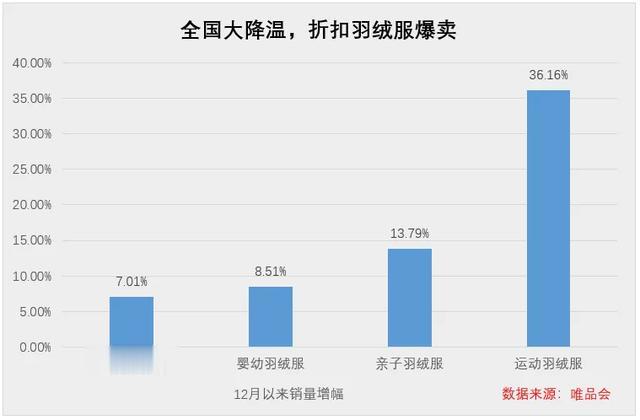 其实,很多价格在1000元以下的折扣羽绒服还是有市场的。比如做服饰特卖有优势的唯品会上,近期平台上雪中飞、鸭鸭等国产羽绒服品牌,大部分价格折扣到100-400元左右,性价比不错,受到90、00后的青睐。12月以来运动羽绒服猛增36%、亲子羽绒服增长13%,女士羽绒服增长7%。
