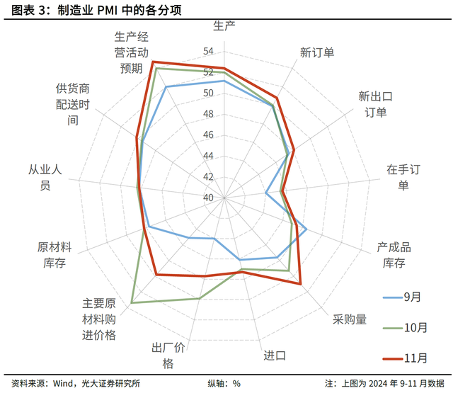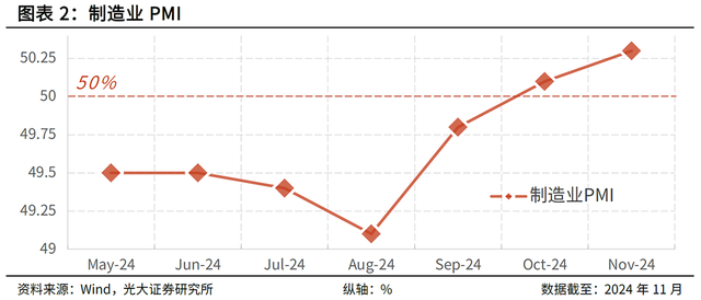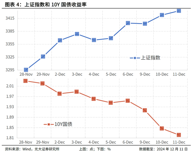 再如,银行贷款所形成的利息收入是随时间而积累的,现阶段新发放贷款所积累的利息对于今年利润的增厚作用较为有限,而此时债券市场又存在赚钱效应,因此不免有个别银行激进地通过利率债市场博取利润,这甚至有可能进一步降低其通过发放贷款支持实体经济的积极性。另如,12月9日政治局会议提出明年将实施适度宽松的货币政策,这也对债券市场的上涨形成了支撑。需要注意的是,政治局会议不仅提出要“实施适度宽松的货币政策”,还强调要“推动经济持续回升向好”,这两者对于债券收益率的影响方向刚好相反。从中长期来看,债券的走势主要由投资者对于货币政策和经济基本面的预期所决定,且经济基本面还是货币政策最根本的影响因素。近段时间以来,经济运行状况以及市场主体的预期已较7、8月有所改善。例如,至11月制造业PMI已连续三个月上升,且后两个月皆处于扩张区间(即50%以上)。再如,11月制造业PMI中生产经营活动预期指数为54.7%,已连续两个月回升,表明多数制造业企业对未来市场信心有所增强。另如,今日上证指数收于3432.49点,已较11月28日收盘价上涨了4.15%,反映出资本市场投资者对于经济预期的升温。
