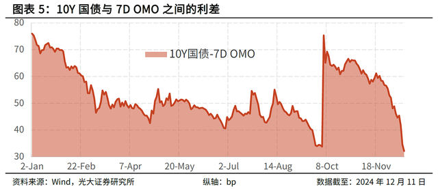 显然,推动经济持续回升向好不会只依靠货币政策,12月9日的政治局会议中亦提到了“实施更加积极的财政政策……打好政策‘组合拳’”。一般而言,财政政策的发力对于债券市场是偏负面的,因为其不仅会扰动债券市场的供需关系而且还会影响到投资者对经济基本面的预期。而且,货币政策的种类较多,其中一部分政策是有助于推动债券收益率下行的,而其余政策则不会。例如,再贷款等结构性货币政策工具对债券市场走势的影响有限,且细论起来其宽信用的作用还会推高债券收益率。此外还需要注意的是,现阶段债券市场的估值并不便宜。近三日(注:即12月9-11日,DR007的日度波动较大因此我们采用三日均值进行研究)DR007的均值为1.78%,当前10Y国债收益率为1.82%。收益率曲线的7D端与10Y端仅相差4bp,显然这样的形态是过于平坦了。当前10Y国债与OMO间的利差为32.18bp,已形成了自今年初以来的最低值。(注:当然也是自去年初以来的最低值。)如此低的利差隐含着投资者对于OMO降息的预期。我们亦认为明年政策利率会进一步下行,且幅度有可能还不小。(注:相关讨论烦请参见我们的报告《抢眼的“适度宽松”——2024年12月9日政治局会议精神学习体会》。)但问题是,倘若近期政策利率不降,经济金融数据又进一步改善,市场会不会对债券进行重定价?所以,此时宜注意控制久期风险。