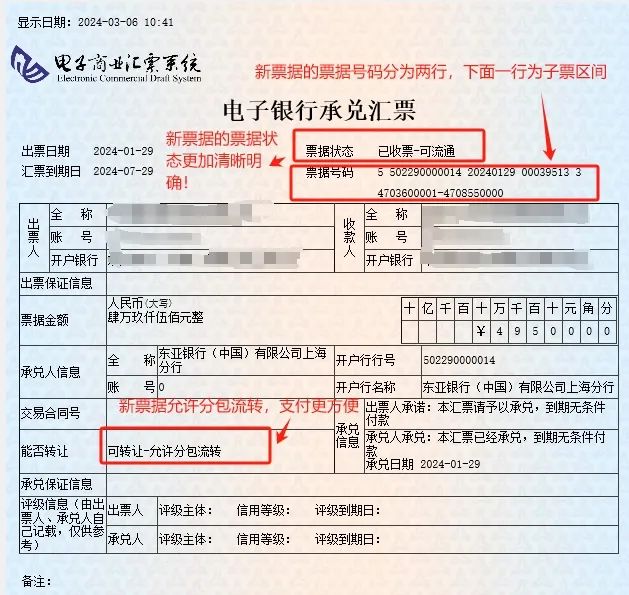 新一代票据变化亮点:可拆分流转、支付更灵活、票据状态更明确、用票更安全、到期自动提示付款、收款更及时等。