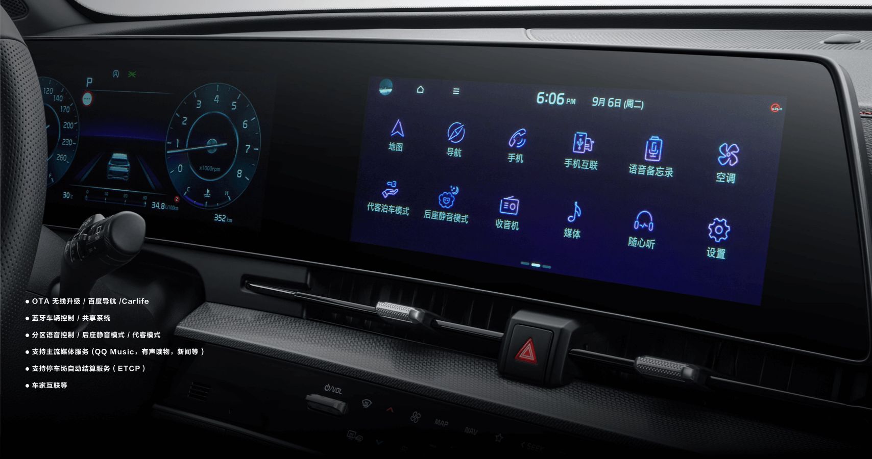 在这个智能化无处不在的时代,车机智能体验程度也成了大家衡量出行体验的重要指标。狮铂拓界在车机配置方面,几乎满足了年轻人对数字化、科技化的所有需求,其搭载了12.3英寸炫彩仪表盘+12.3英寸多媒体触控屏幕,将车内科技感拉满,并配备了功能丰富的Kia Connect&百度智能互联系统3.0 智能互联系统,像智能导航、车家互联、OTA无线升级等日常出行中高频使用的功能都应有尽有。
