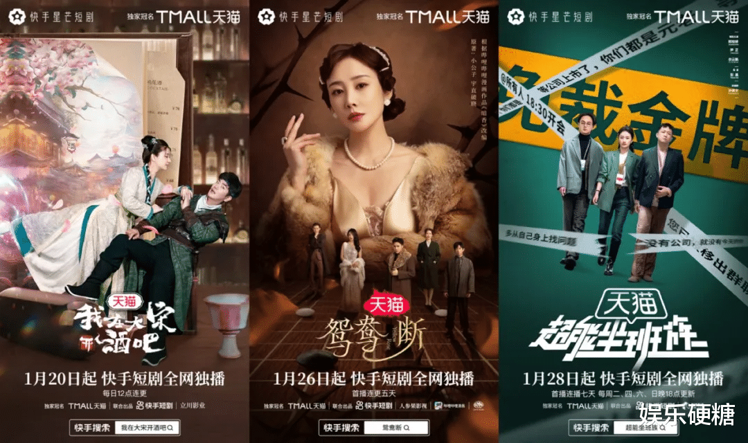 早在2024年寒假档,快手就联合天猫开启“大明星、精制作”新模式,推出《超能坐班族》《我在大宋开酒吧》《鸳鸯断》三部精品短剧,助力“天猫年货节”在春节营销节点突围。三剧阵容涵盖了郭晓婷、尹正、张晓龙、斓曦、李纯等专业演员,播放量累积达到13.7亿。