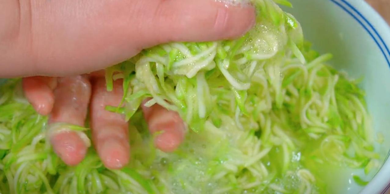 挑选几根嫩绿的西葫芦,洗净后擦成细丝,加点盐腌渍片刻,挤掉多余的水分,这样更能保持其清爽的口感。