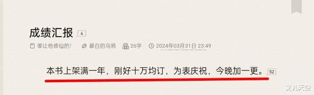之前提到白乌鸦三月份有望十万均订,时间正好也赶在了月底,而且正好也是小说上架一周年的节点,各方面还是非常应景的。