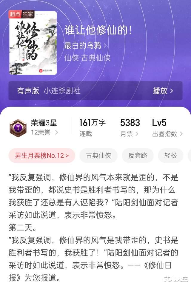 今天的第一更来说一下“最白的乌鸦”作品《谁让他修仙的!》突破了十万订的事。