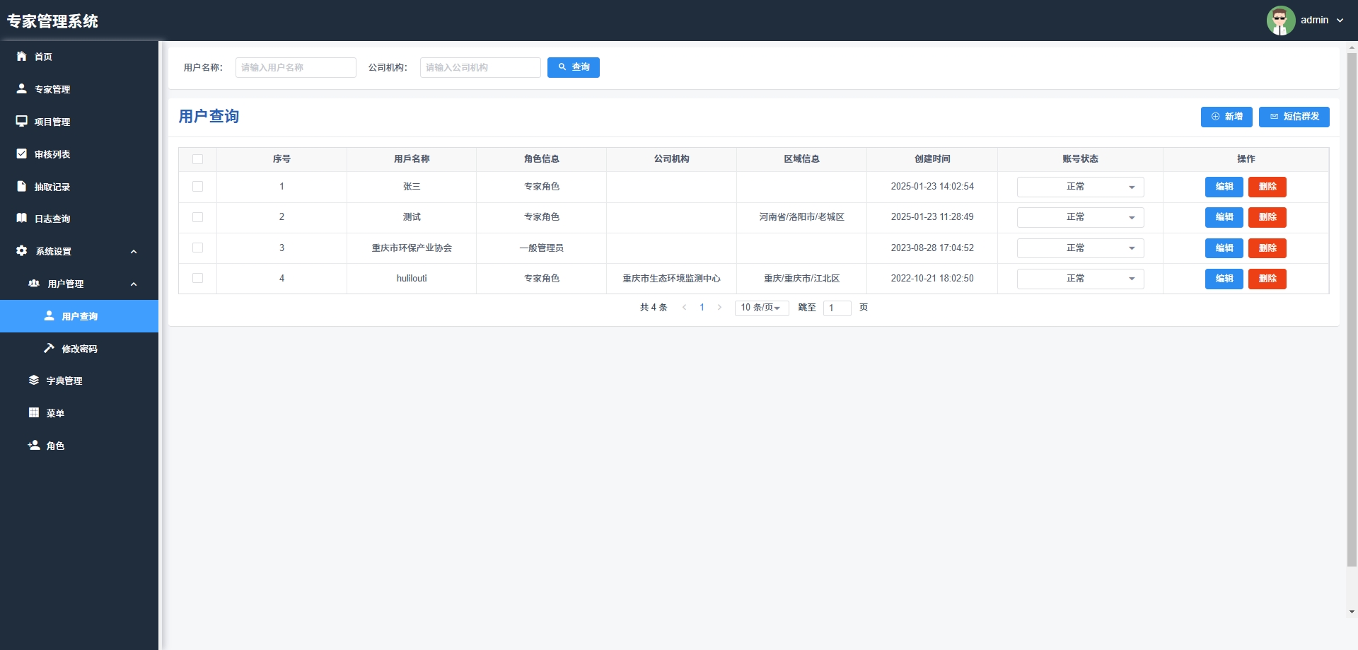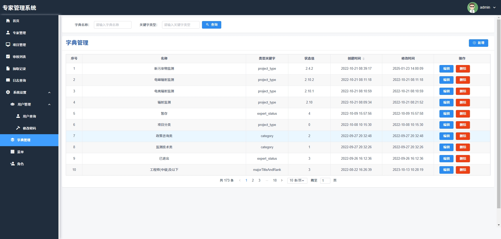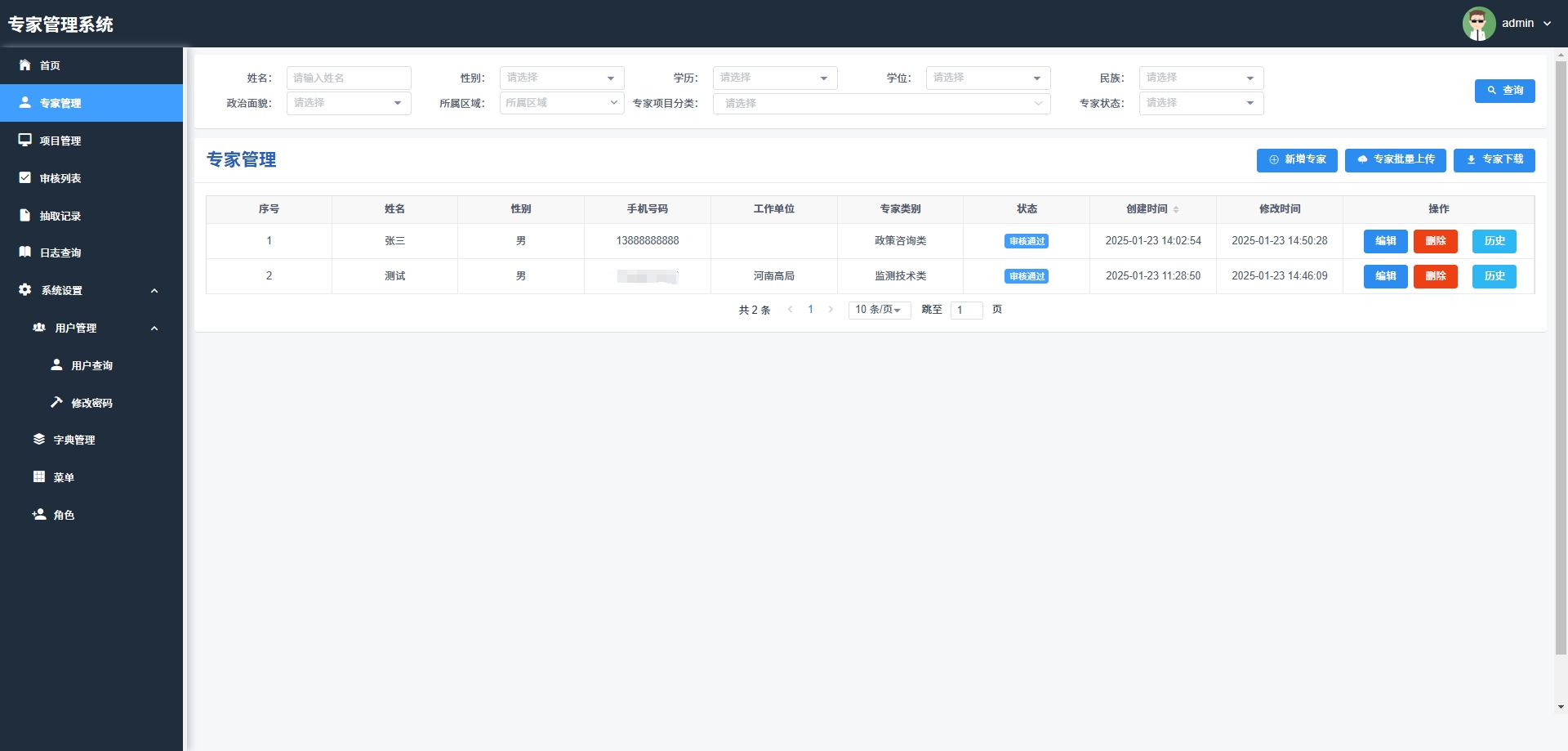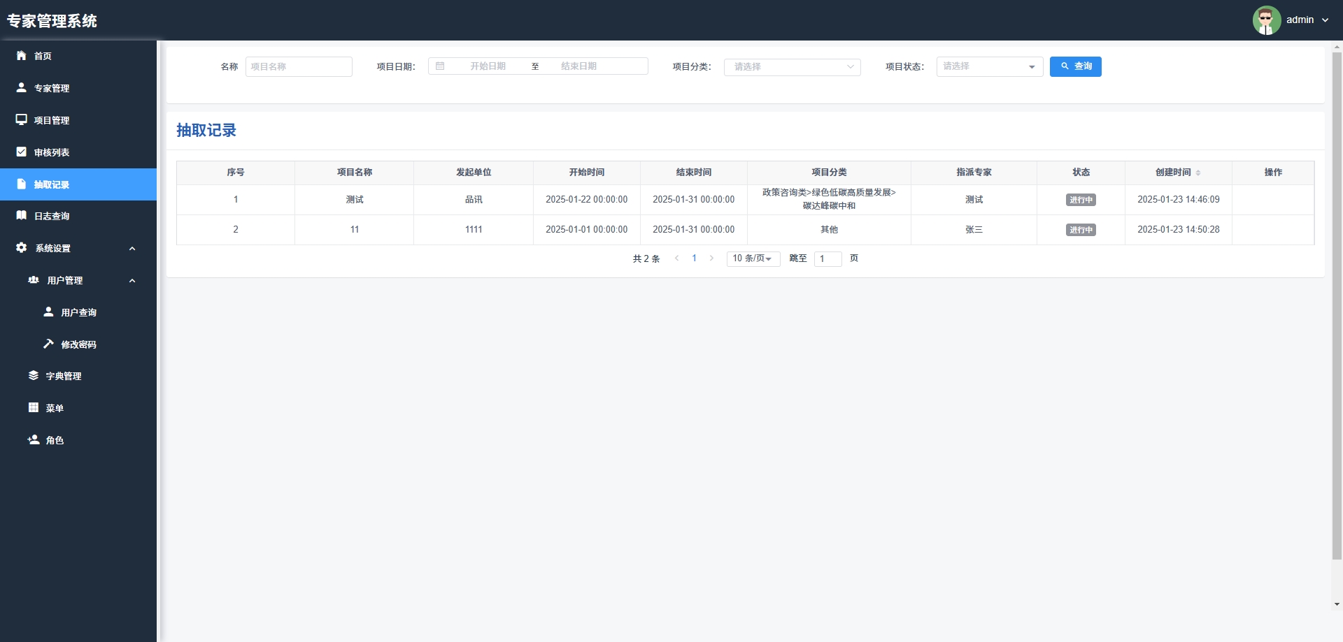 功能解析首页系统的主界面,提供快速访问其他功能模块的入口。专家管理负责专家信息的维护,包括添加、编辑和删除专家资料。项目管理用于规划、跟踪和控制项目的进度和资源。审核列表展示待审核和已审核项目的列表,便于管理和决策。抽取记录记录系统操作或数据抽取的详细日志,用于审计和回溯。日志查询提供日志的搜索和查看功能,帮助用户快速找到特定日志条目。用户管理用户查询:允许搜索和查看用户信息,支持按条件过滤用户。修改密码:提供用户修改账户密码的功能,增强账户安全性。系统设置字典管理:管理系统使用的字典数据,如国家、职位等分类信息。菜单:定义和维护系统菜单项,控制用户界面的导航结构。角色:管理系统角色及其权限,确保用户访问控制和数据安全。代码结构与框架优势服务端MySQL 5.7+ :作为数据库,确保数据稳定性和高效性。JDK 1.8+ :提供Java运行环境,支持复杂的业务逻辑处理。Redis:作为缓存,提升数据访问效率,减少数据库负载。前端VUE 2.6.14:与element-ui 2.15.6结合,提供响应式和组件化开发,界面开发高效灵活。NODE 14.21.3 (>=8.9) & NPM: >=3.0.0:保障前端开发环境稳定,依赖管理便捷。结语
