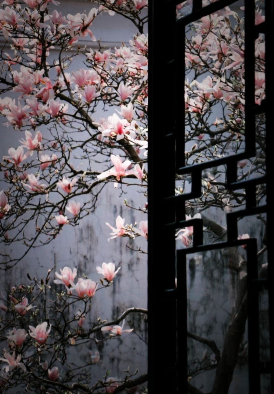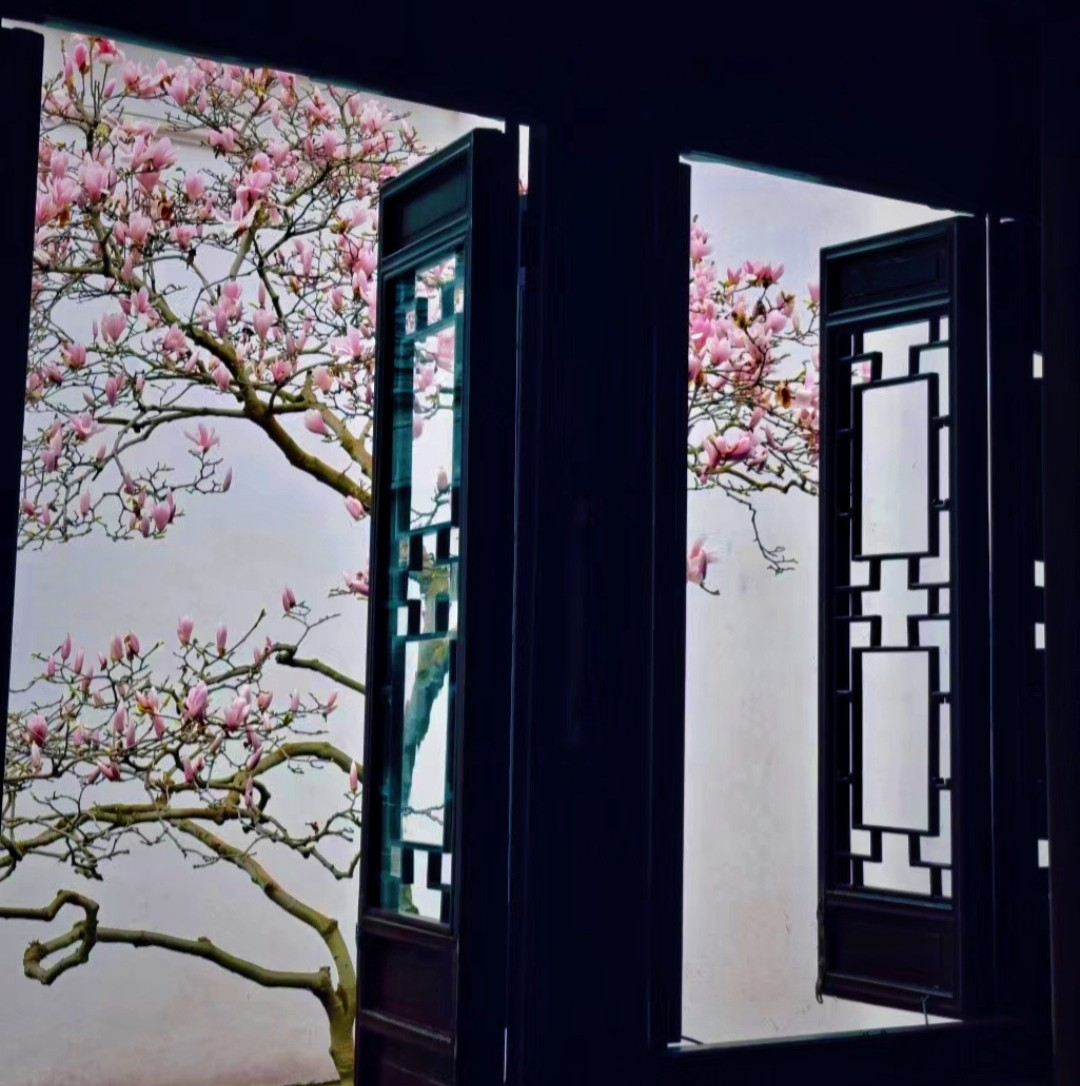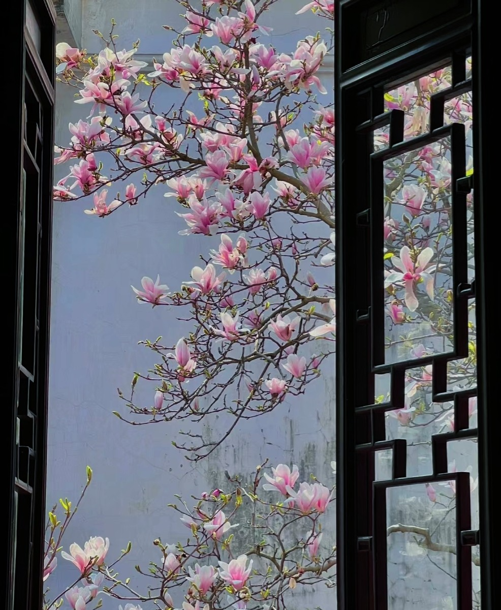 雕花的窗棂,古朴的木质,透过它望去,玉兰的洁白与粉嫩在阳光下熠熠生辉,本身就是一幅画。