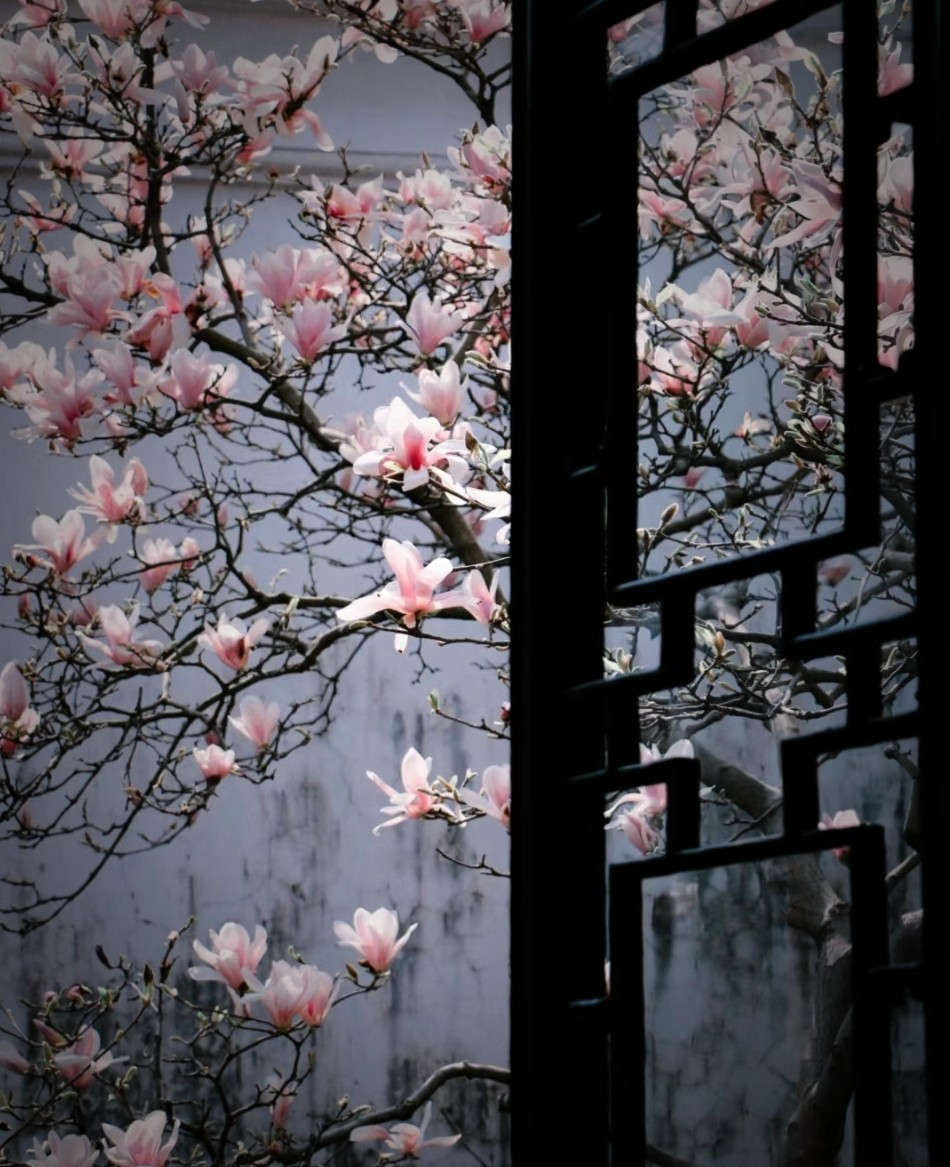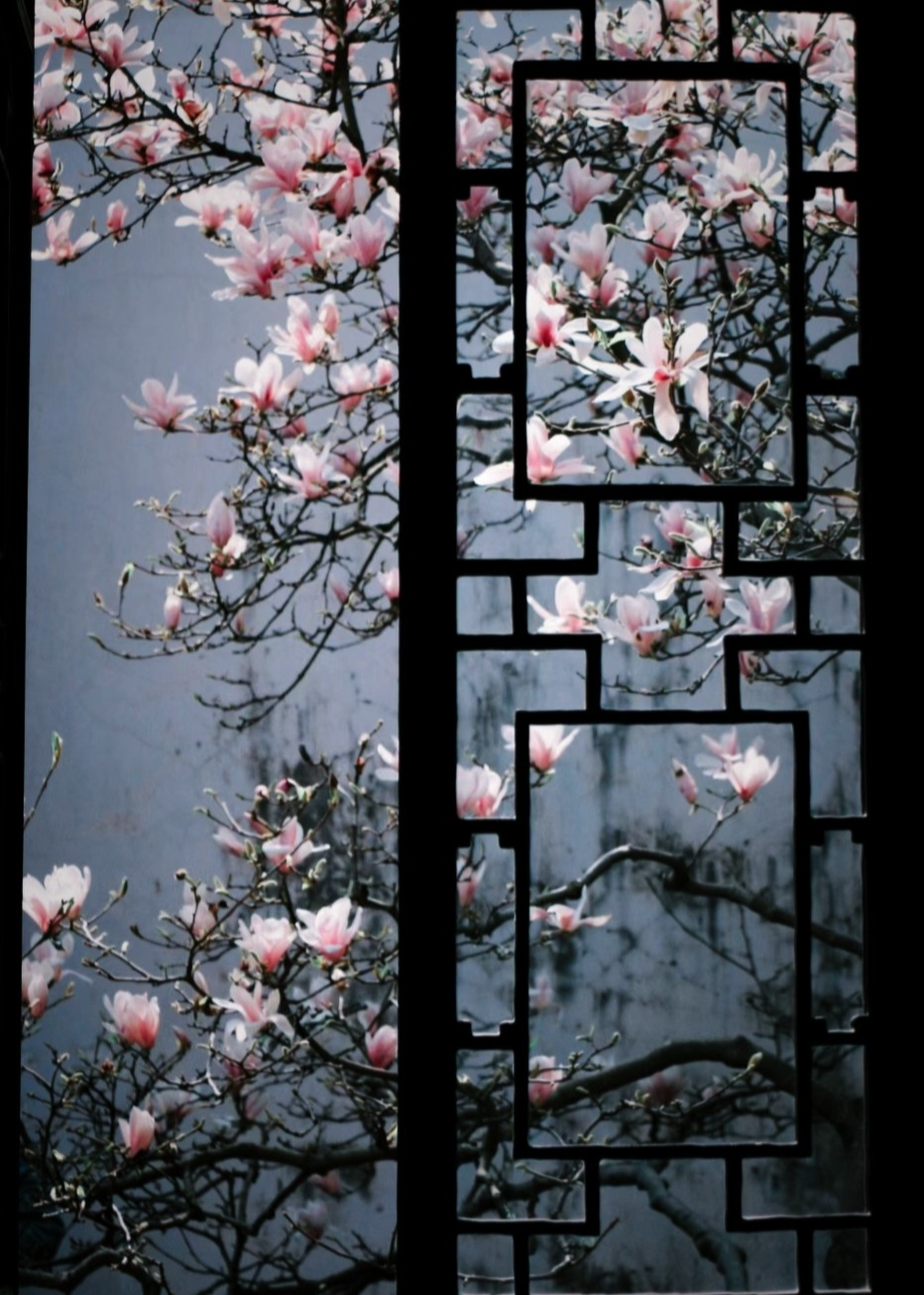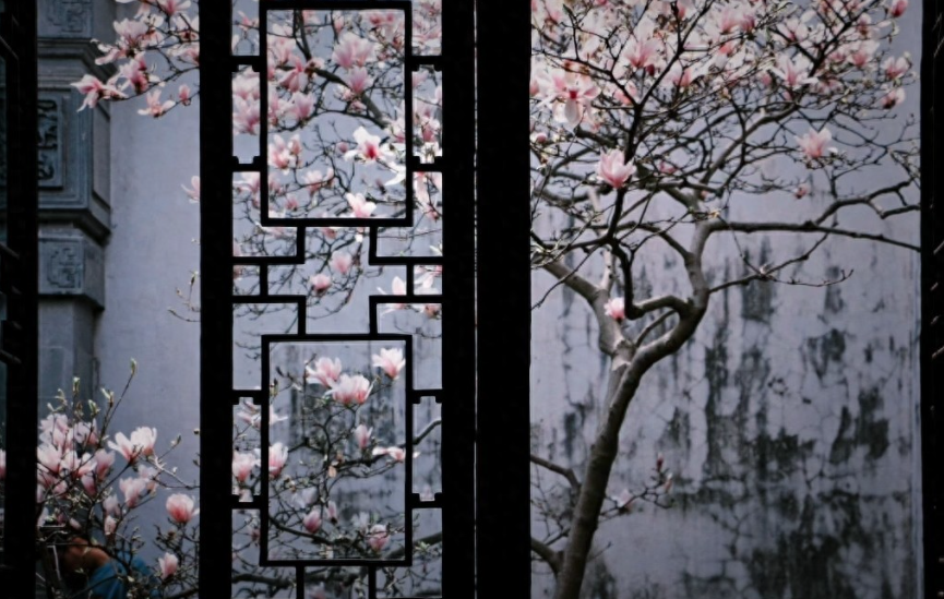 雕花的窗棂,古朴的木质,透过它望去,玉兰的洁白与粉嫩在阳光下熠熠生辉,本身就是一幅画。