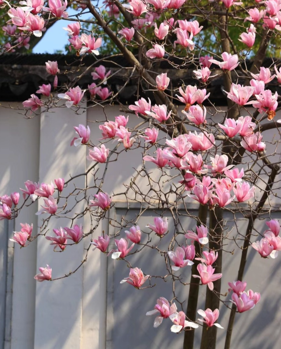 花影扶疏处,藏着姑苏造园的极致巧思。粉墙作宣纸,黛瓦为卷轴,两株玉兰恰似丹青圣手精心点染的双生墨韵。