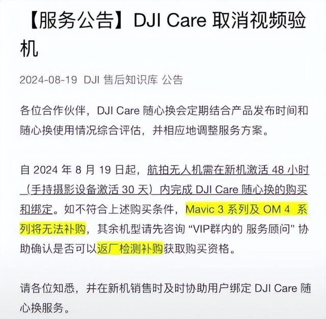 自2024年8月19日起,航拍无人机需在新机激活48小时(手持摄影设备激活30天)内完成DJICare 随心换的购买和绑定。如不符合上述购买条件,Mavic 3系列及OM4 系列将无法补购,其余机型请先咨询“VIP群内的 服务顾问”协助确认是否可以返厂检测补购获取购买资格。
