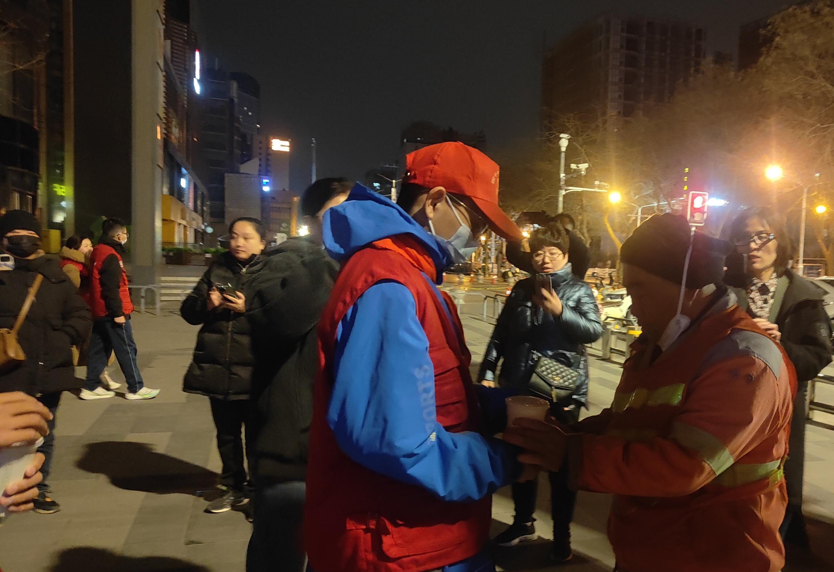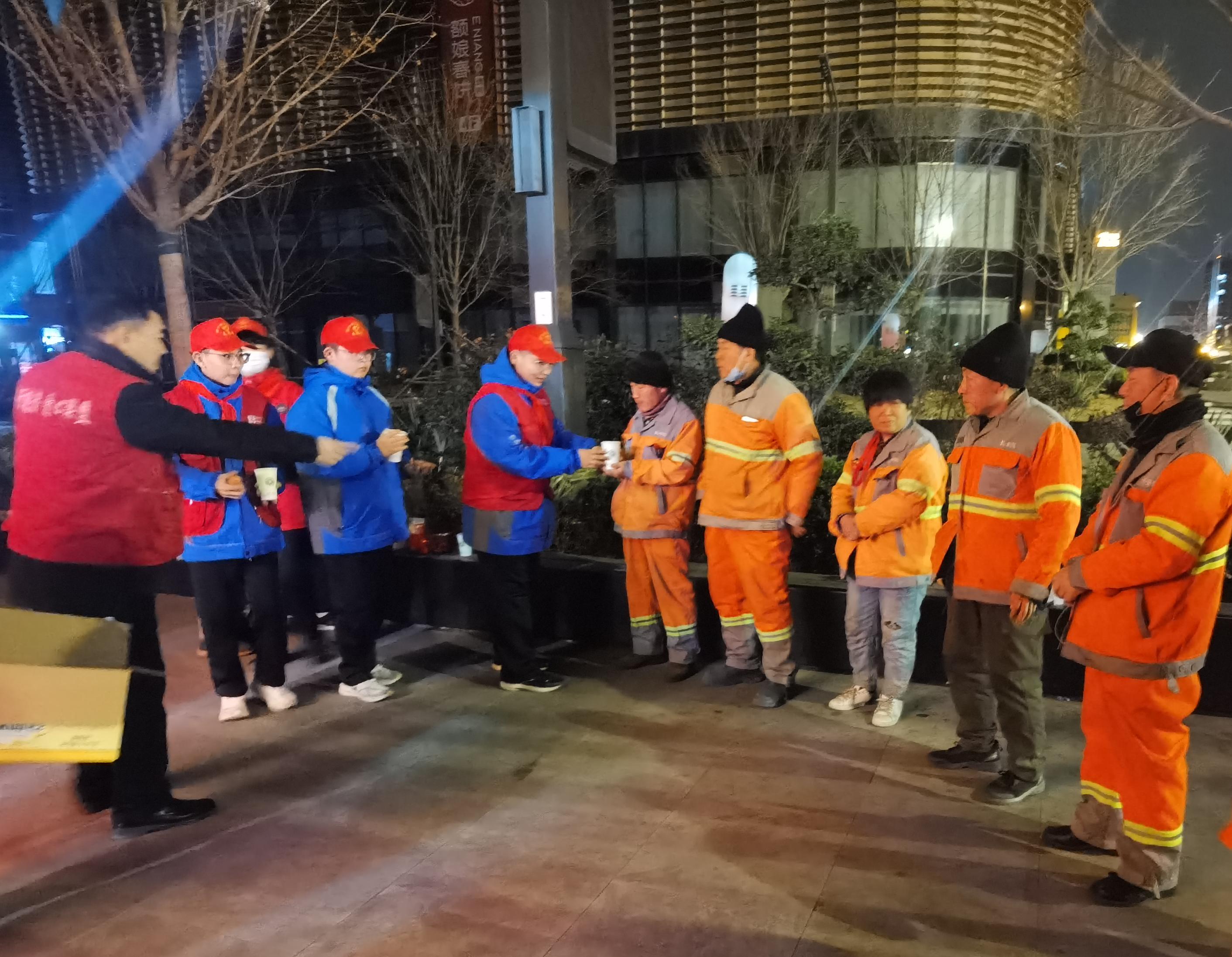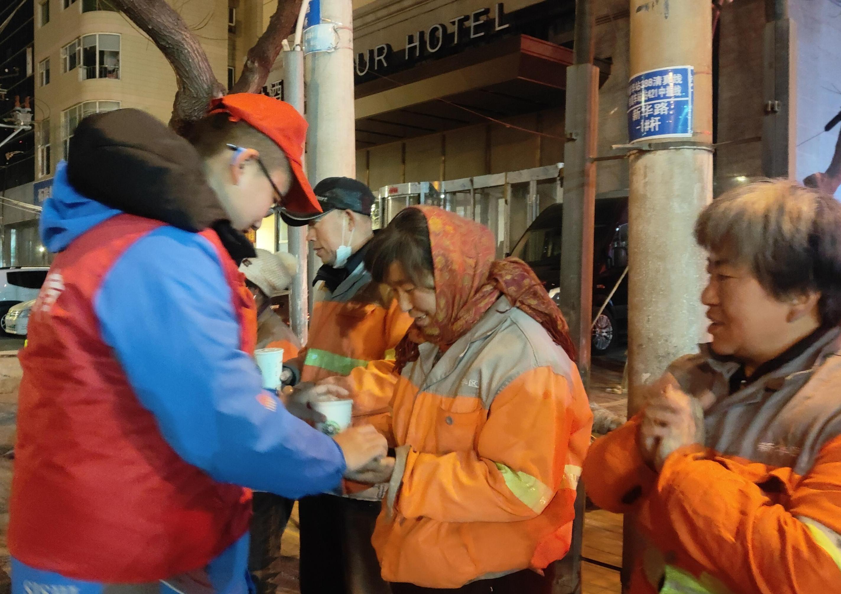 天色未明,南三条街道已跃动着点点“志愿红”。在基地工作人员的指导下,老师、孩子们仔细分装着每一份热豆浆、鸡蛋等,并将这些早餐搬、抬到指定集合点,然后亲手将热气腾腾的爱心餐和亲切温暖的问候送到每一位环卫工人。