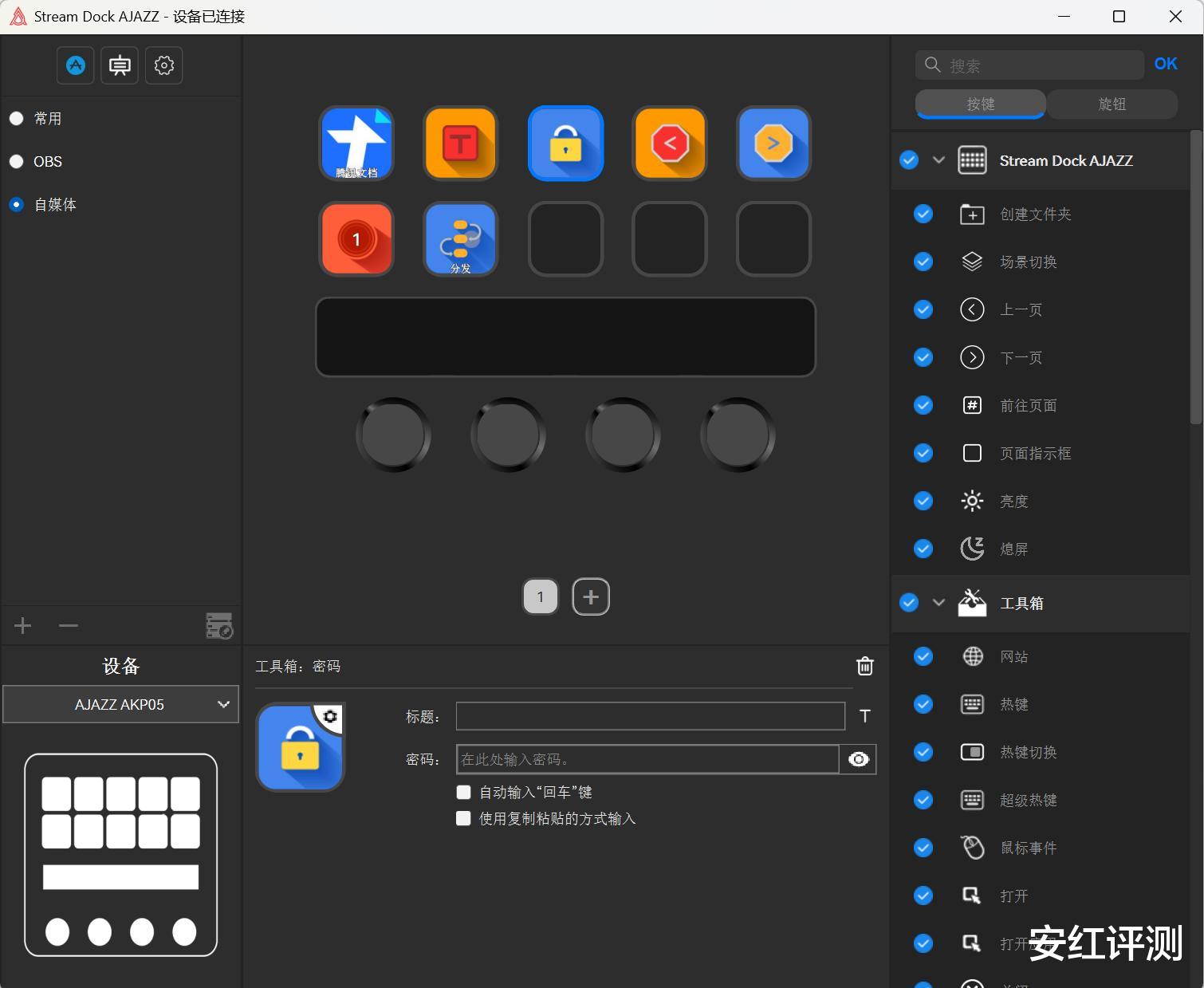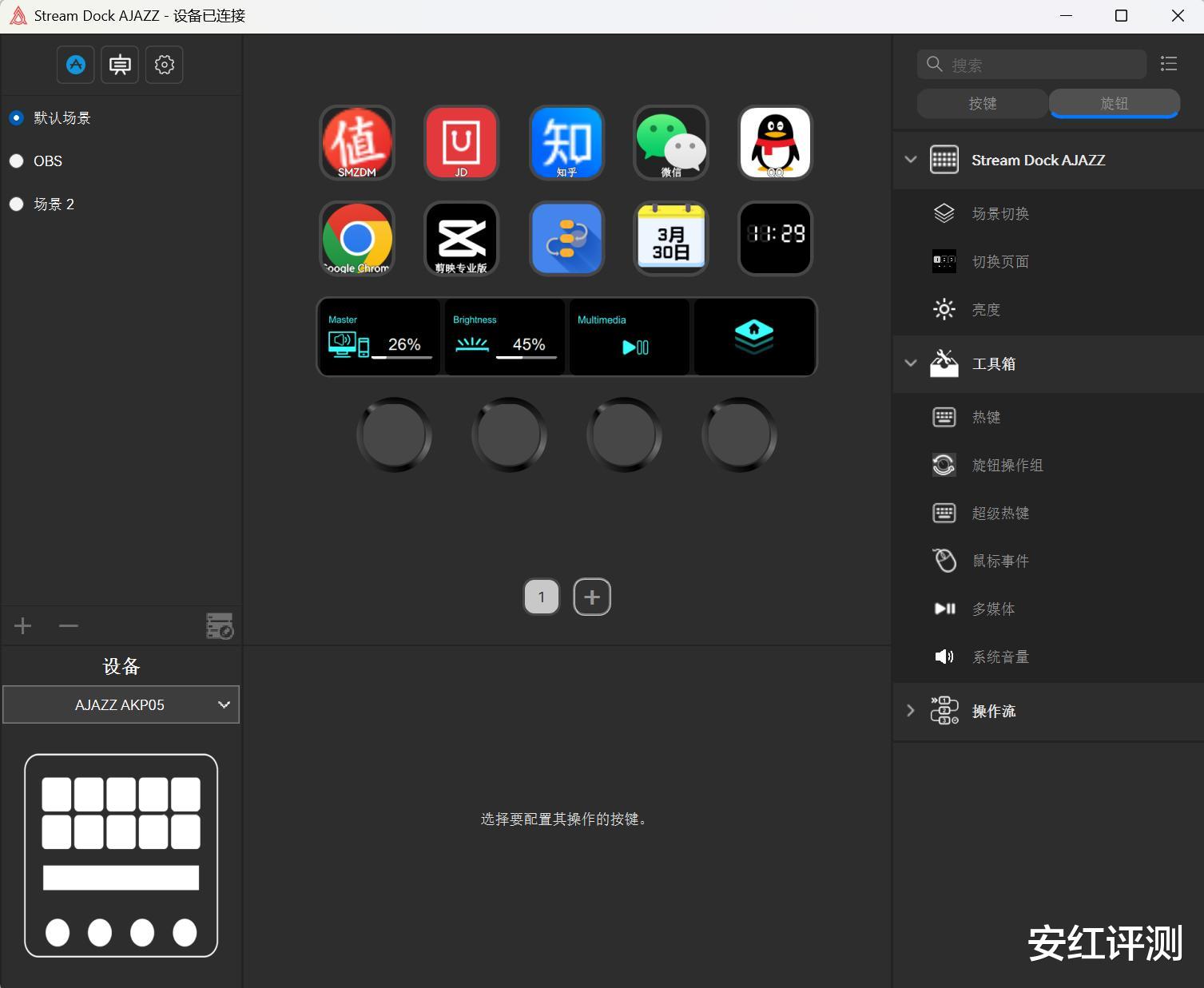 黑爵为AKP系列配置了专属软件Stream Dock AJAZZ。连接PC后默认AKP05并开启相应的显示调节画面。此款软件横向采取左中右布局,左侧是多场景展示控制模块,中间是按键、触控和旋钮编辑区域,右侧则是按键和旋钮的功能插件可选列表。整体看UI设计比较简洁。