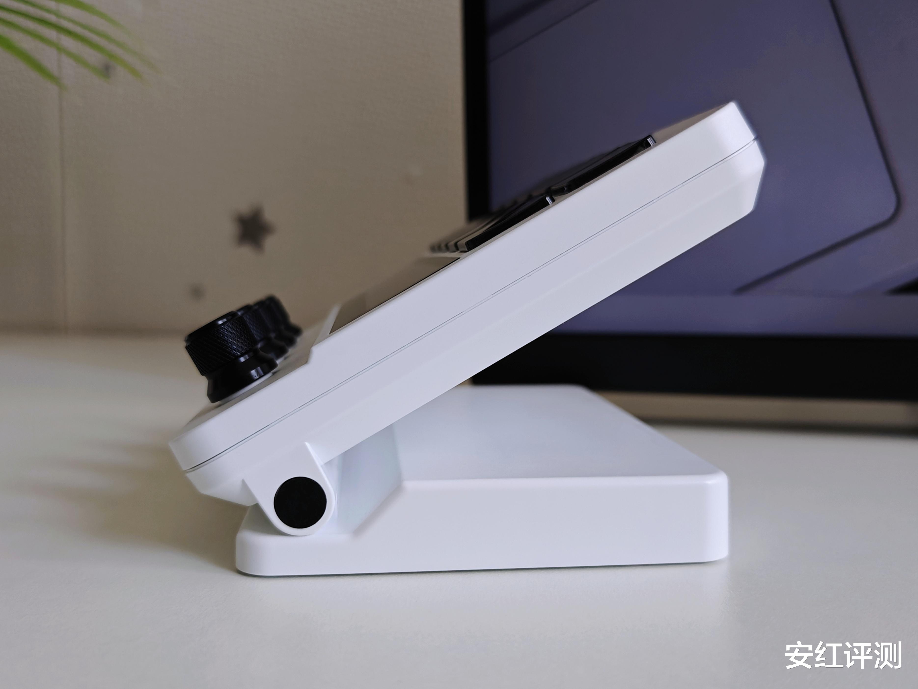 而底部为控制旋钮区域,由四个同规格黑色旋钮组成。其功能同样可以DIY。另外由于旋钮的特性,可以通过左旋、右旋和按压实现三种操作,比较适合开/关、音量、亮度和缩放等等调节,直观快捷。同时旋钮旋转调节时有阻尼段落感,反馈良好。