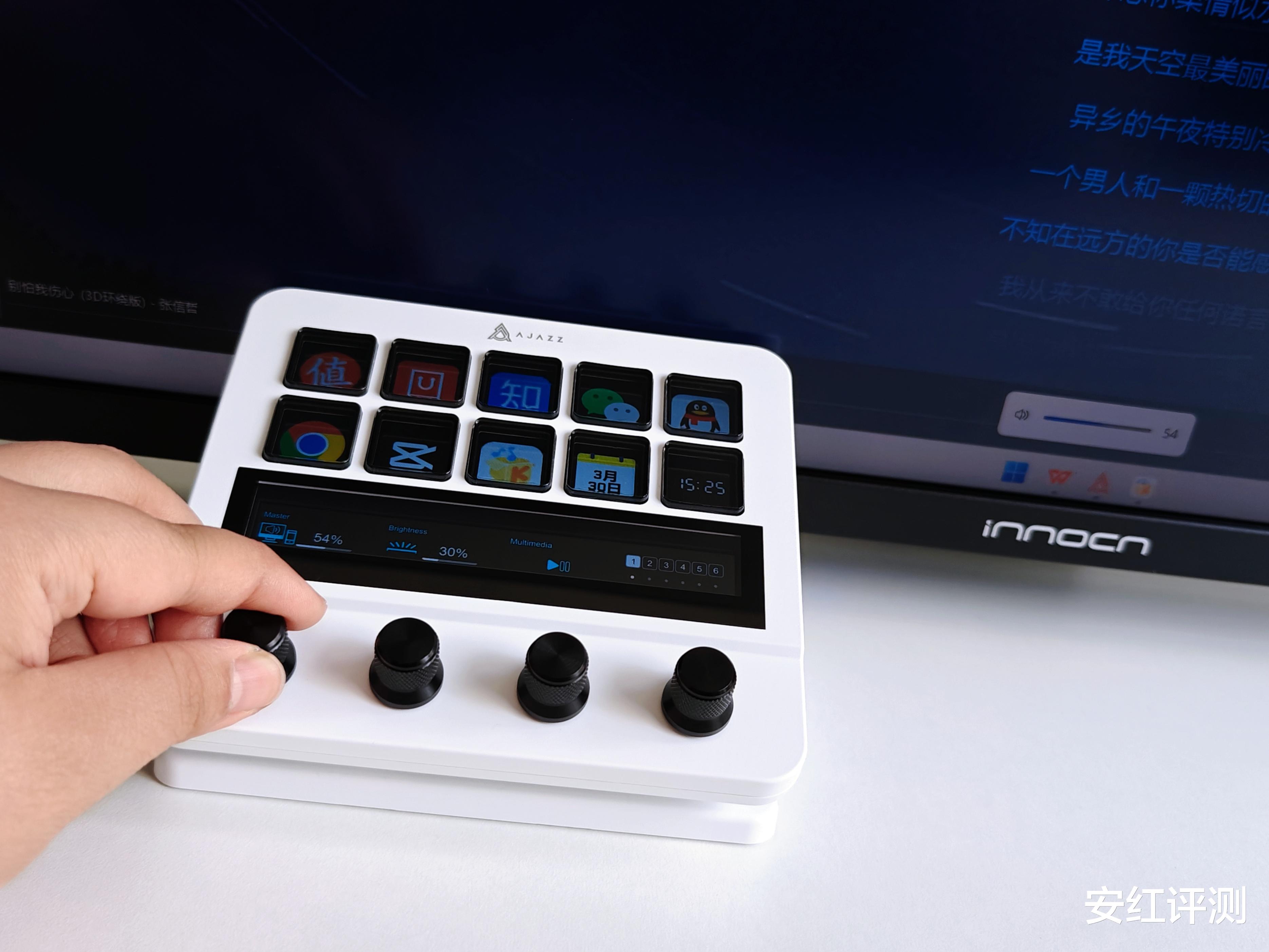 触控和旋钮部分则联合设置了音量、亮度、多媒体以及页面。可以旋转按钮调整音量、亮度、歌曲选择以及按键显示页面切换等。这对于爱听歌的我来说,简直是完美音乐控制台。相对于键盘控制音乐,它对于歌曲控制非常到位。通过按键可以打开音乐软件,接下来使用触屏和旋钮即可进行播放,选择上一曲和下一曲,还能实现音量调节、页面切换等多媒体功能。