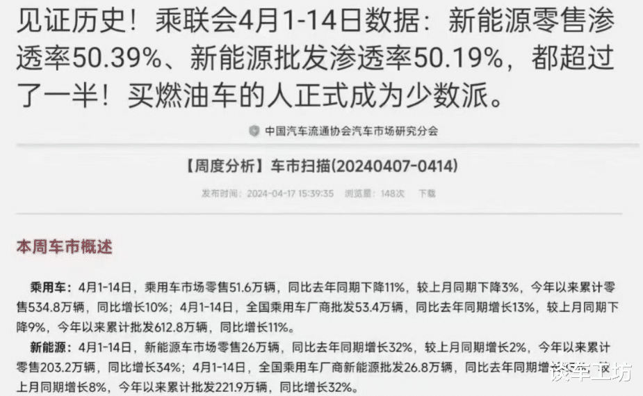 2024年4月,一个划时代的节点悄然而至——4月1日-4月14日短短的2周时间内,新能源汽车渗透率突破50%的喜讯传来,标志着中国汽车市场正式迎来新能源时代,传统燃油车正在逐渐沦为少数派。