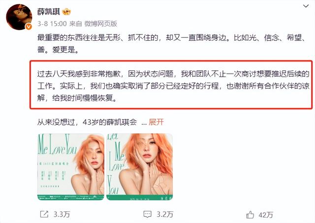 “本来演唱会的官宣我想再晚点,但我真的不想因为自己的脆弱影响其他的人。最后我还是要做一个理智的人,晚点(公布)有什么好处?好像只是可以让我舒服一些。”
