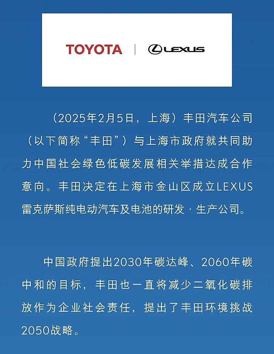 此前丰田汽车公司已经与上海市政府就共同助力中国社会绿色低碳发展相关举措达成合作意向,决定在上海市金山区成立雷克萨斯纯电动汽车及电池的研发和生产公司。