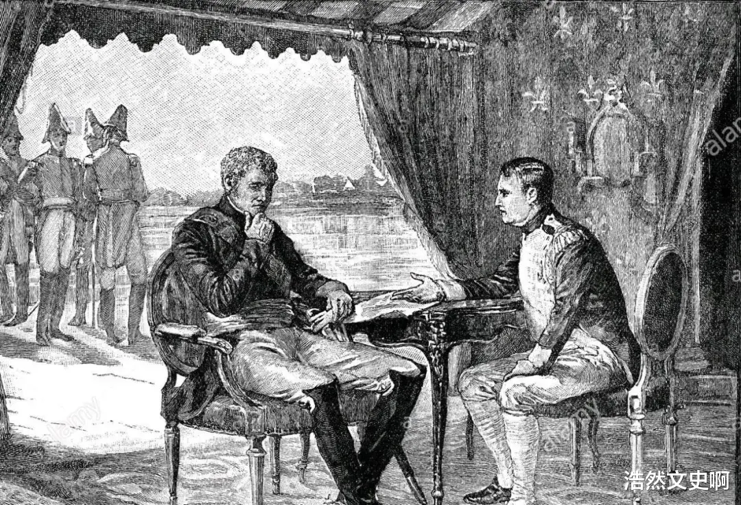 拿破仑特地跟沙皇在涅曼河上会面签订了《提西特尔条约》,拿皇把从普鲁士那里抢来的别洛斯托克地区赠送给亚历山大一世换取两国和平。亚历山大承诺从此跟搅屎棍一刀两断不再掺和反法同盟。