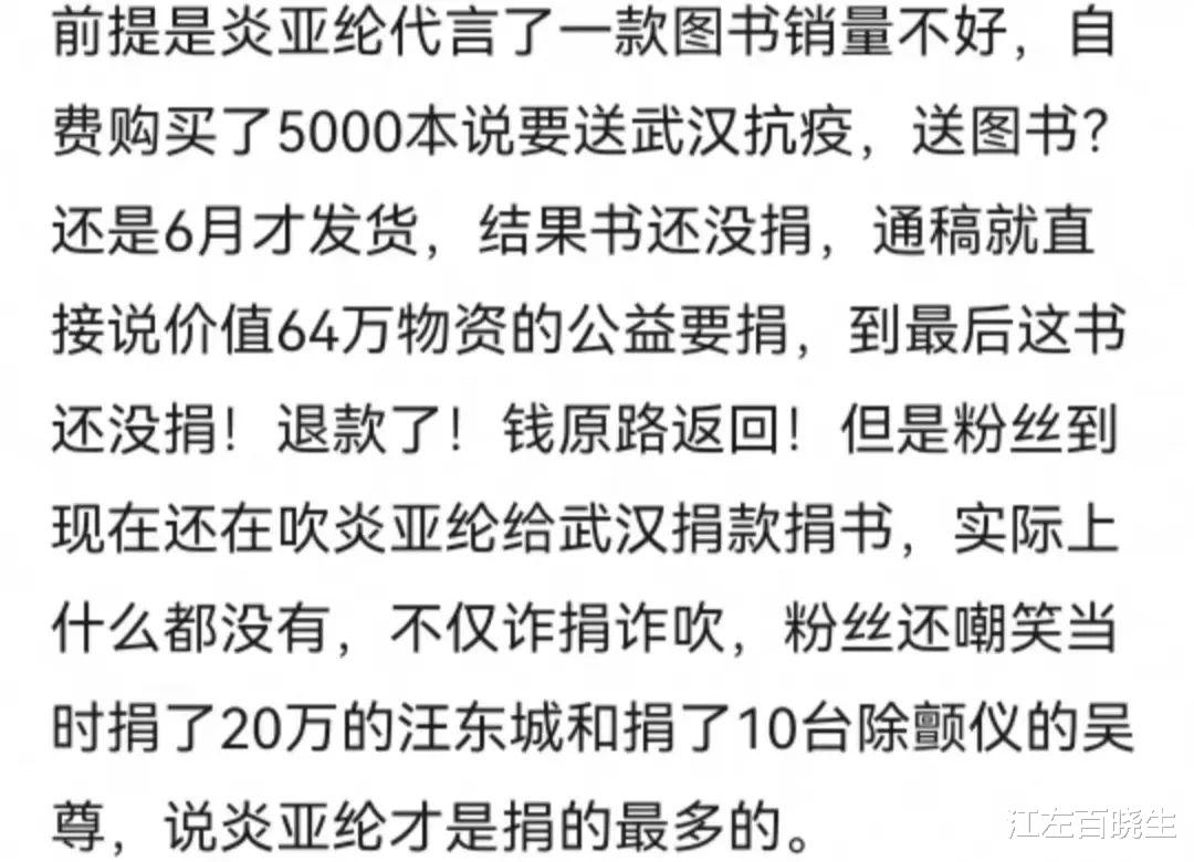 结果图书要六月才能发货,炎亚纶支付的钱早就原路返回了,只有粉丝还在吹炎亚纶给武汉捐款捐书,其实只是捐了一个寂寞。
