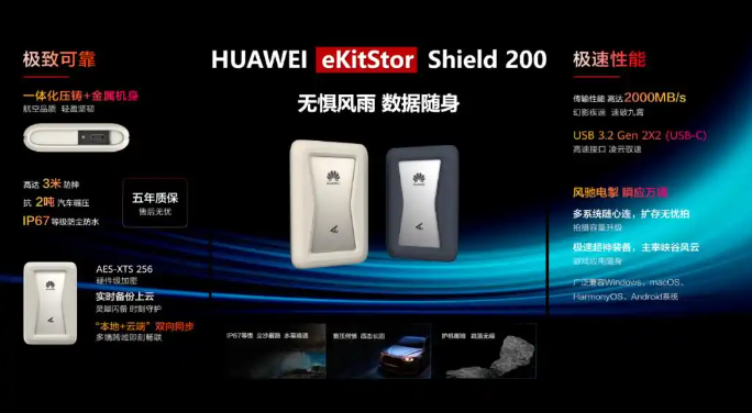 除了 HUAWEI eKitStor Xtreme 116P,华为还发布了一款专为移动办公、旅行摄影、家庭数据备份等场景设计的高防护移动固态硬盘 ——HUAWEI eKitStor Shield 200。该产品全机身配备航空级铝材,具备顶级三防功能,采用一体化压铸 + 金属机身,支持高达 3 米防摔,可抗 2 吨汽车碾压,甚至支持 IP67 等级防尘防水。同时,eKitStor Shield 200 采用 USB 3.2 Gen 2X2 接口,提供了高达 2,000MB/s 的顺序读能力,满足用户对高性能移动存储的需求。该硬盘广泛兼容 Windows、MacOS、HarmonyOS、Android 系统,采用 AES-XTS 256 硬件级加密,支持实时备份上云、“本地 + 云端” 双向同步。