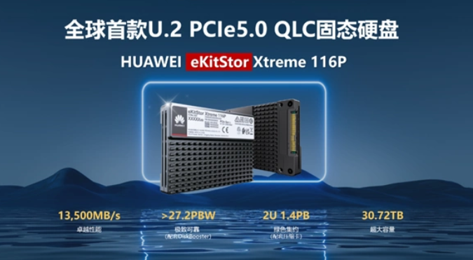 HUAWEI eKitStor Xtreme 116P 是业界首款 U.2 PCIe 5.0 QLC SSD。官方介绍称,该产品顺序读带宽高达 13.5GB/s,能够极大地提升数据处理效率。单盘可用容量可达61.44TB,为用户提供了海量的存储空间。而且,它支持全闪存替代 HDD,在同等 TCO 下性能提升 2.4 倍,容量提升 2 倍,空间节省 50%,为数据中心和企业级用户提供了更高性能、更低成本的存储解决方案。