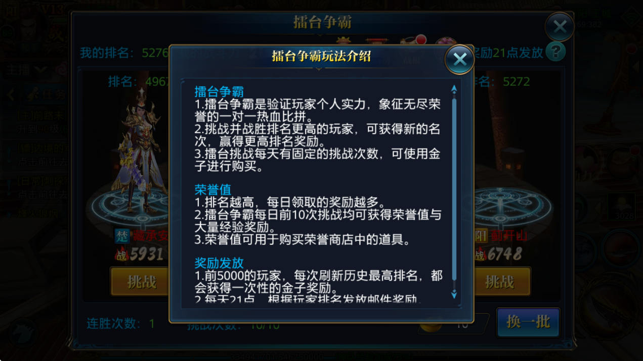 玩家如果对自己的实力有信心,可以参与擂台争霸挑战比自己排名更高的玩家获得新的名次,擂台挑战每天有固定的挑战次数,如果想要获得额外挑战次数,可以用金子进行购买,排名越高每日领取的奖励越多。每日前10次挑战均可获得荣誉值和大量的经验奖励。
