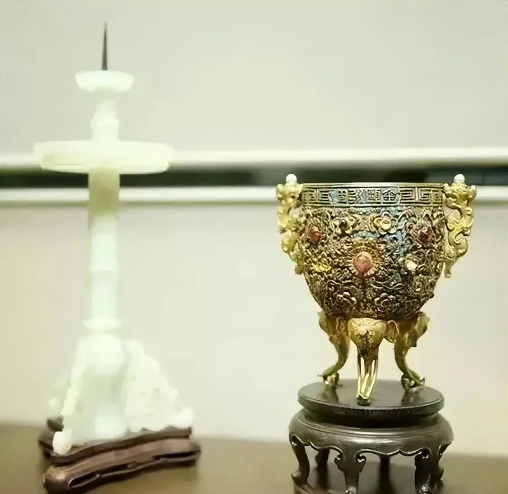 他要求仪式的烛台要“玉烛长调”,笔则名为“万年青”,喝酒的杯子自然也要高端大气上档次。乾隆丰富内务府制作金质三足爵杯。