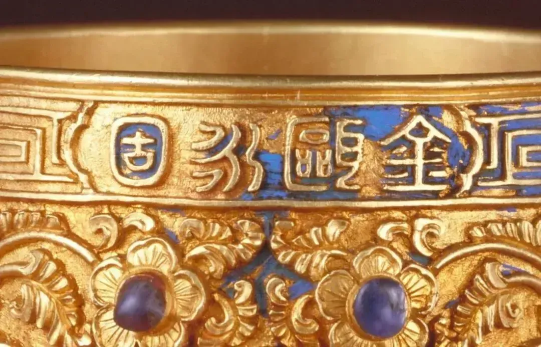 金杯上镶嵌珍珠、蓝宝石、红宝石、碧玺,珍珠象征健康,蓝宝石被当作护身符,红宝石又名照殿红,象征纳福聚财,碧玺又叫“碎邪金”,有辟邪之意。