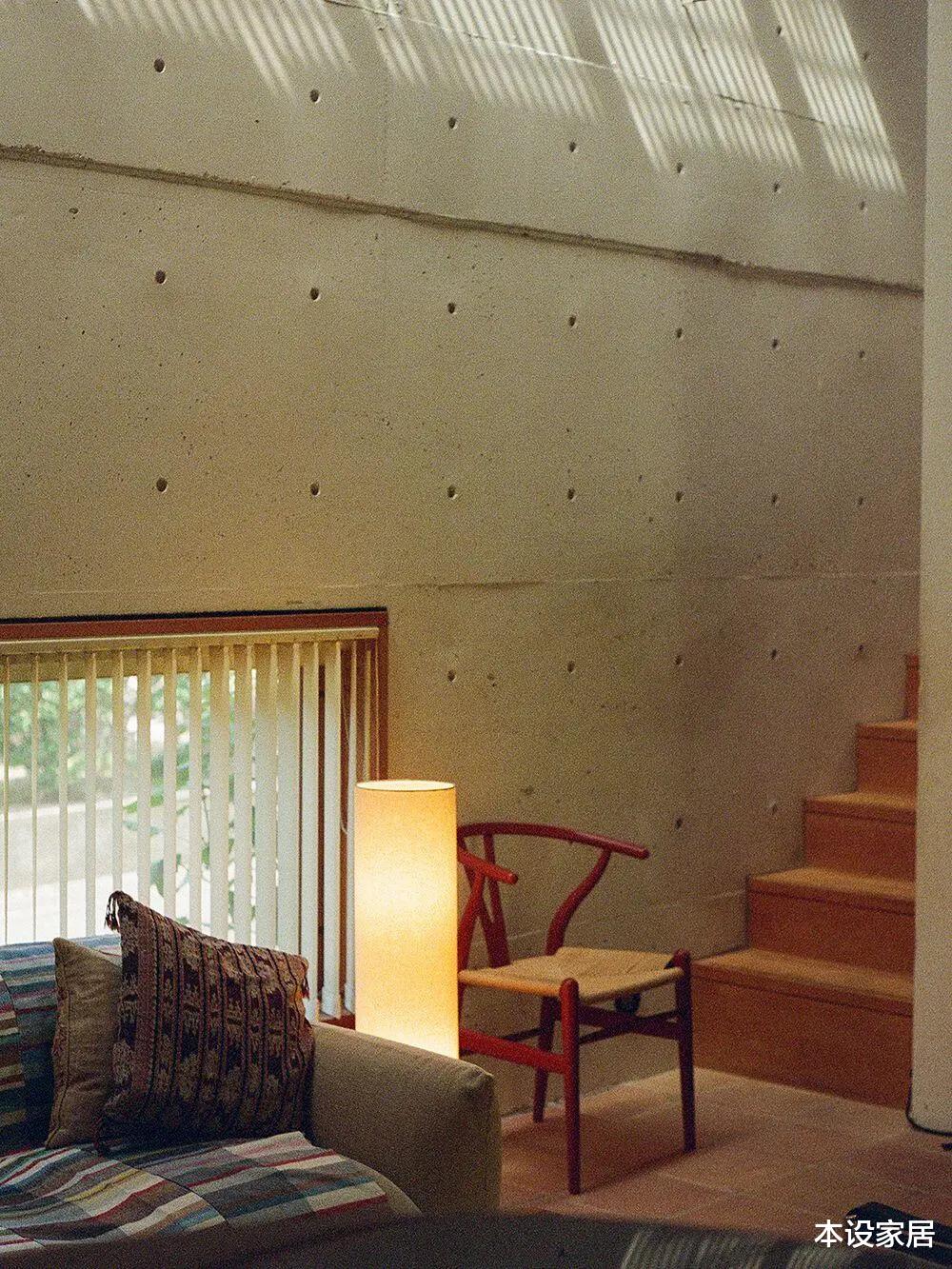 引人注目的是极简的窗边,布置了一组经典的“Y”椅和落地灯,与混凝土的冷硬相映成趣。