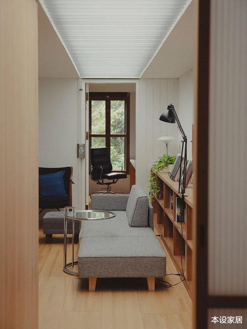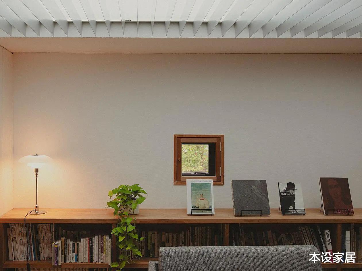 在书柜上方的墙面,开了一个30公分见方的小窗,刚好处于站立时也能看到外面郁郁葱葱的绿植,好治愈,考虑的实在太周到了。