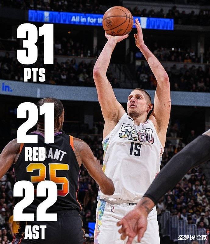 约基奇全场比赛狂砍 31 分 21 篮板 22 助攻的超级三双。