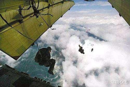 此时解放军战士面露坚韧的神色,义无反顾地跳下飞机,最终历时17分钟,15名解放军空降兵全部安全着陆。