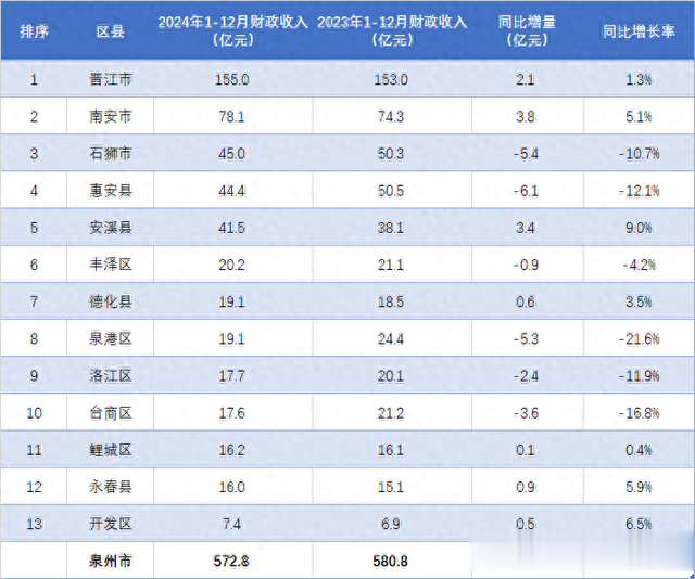 开发区财政收入规模相对较小,是泉州市唯一一个全年累计金额不足十亿的地区,2024年仅为7.36亿元,排在了全市最后一位。不过虽然总量最小,但开发区同比却有不俗表现,其增速达到了6.5%,在全市之中仅次安溪,实属良好!不过由于基数较小,开发区要想实现逆袭,接下来还需倍加努力才行。