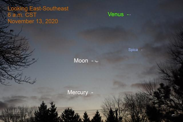 图片说明-2020年11月13日:闪闪发光的金星位于东南偏东近18°处,距离月牙右上角8.1°,距离水星左上角5.5°。新月位于水星左下方6.9°,水星上方5.1°。