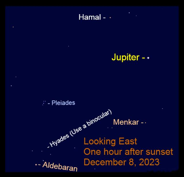 图表说明-2023年12月8日:明亮的木星出现在日落后东南偏东的地方。